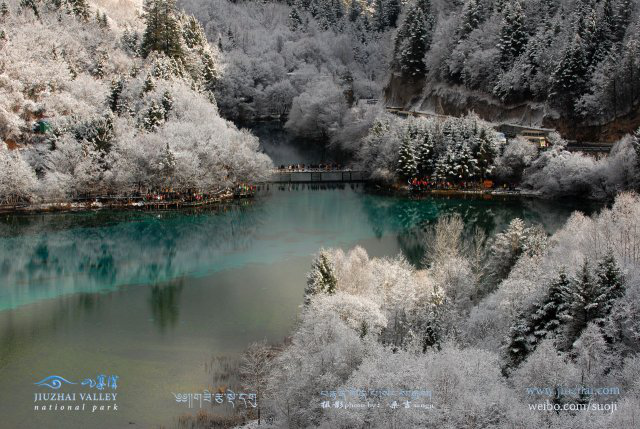 九寨溝四周群山聳峙,有雪峰數(shù)十座,高插云霄,終年白雪皚皚。河谷地帶奇水薈萃,其間有成梯形分布的大小湖泊114個,瀑布群17個,鈣華灘流5處,泉水47眼,湍流11段,以1870米的海撥高差,在12 座雪峰之間穿林跨谷,珠連玉接,呈Y字型串珠,逶迤近60公里,形成了中國唯一、世界罕見的以高山湖泊群和瀑布群以及鈣華灘流為主體的風(fēng)景名勝區(qū)。湖泊小者數(shù)平方米,最大的長海長達(dá)7公里。湖水終年碧藍(lán)澄澈,色彩斑讕,在陽光照射下,呈現(xiàn)出藍(lán)、黃、橙、綠等多種色彩,絢麗奪目。天氣晴朗時,藍(lán)天、白云、雪山、森林倒映湖中,水光浮翠,美麗如畫,并隨季節(jié)推移呈現(xiàn)出不同的色彩和風(fēng)韻,有“九寨歸來不看水”之說。