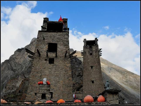 在羌語(yǔ)中,碉樓被稱為“邛籠”,意為美麗、高貴的房子,早在2000年前《后漢書(shū)·西南夷傳》就有羌族人“依山居止,壘石為屋,高者至十余丈”的記載。碉樓的高度在十米至三十米之間,用于御敵、貯存糧食和柴草。碉樓有四角、六角、八角幾形式,有的高達(dá)十三四層。建筑材料是石片和黃泥土,墻基深1.35米,以石片砌成。石墻內(nèi)側(cè)與地面垂直,外側(cè)由下而上向內(nèi)稍傾斜。修建時(shí)不繪圖、吊線、柱架支撐,全憑高超的技藝與經(jīng)驗(yàn)。建筑穩(wěn)固牢靠,經(jīng)久不衰。自唐朝來(lái),羌族人民因各種原因向西北遷移,到了西藏和青海,所以現(xiàn)在,羌族碉樓也往往被稱為藏族碉樓。