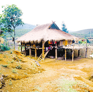 臨滄地區(qū)的耿馬縣芒洪鄉(xiāng)也是布朗族的聚居區(qū)。房屋以草頂居多,也有蓋竹瓦的。三開間居多,門在正中,左邊是火塘,是就餐待客和睡覺的地方,右邊放糧食雜物。房屋為木柱結(jié)構(gòu),縱向框架。大柱立于兩山墻中間,柱腳深埋地下,柱高依屋脊高度而定,柱頂以天然枝杈承托脊檁。以同樣的方法在四角各立頂端帶枝杈的柱子,柱高以屋檐的高度而定,承托邊檁。這樣6根木柱、3根檁木構(gòu)成了主要承重的縱向框架,也形成了雙斜面屋頂。在大柱間密栽小柱,小柱間再橫向綁扎竹片,從地面到柱頂形成密密麻麻的小方格子,這就是墻壁的骨架。然后把和了黃泥漿的長草把一綹綹、均勻地掛到竹片上,將里外抹平,干后就成了“掛”著的草泥墻。