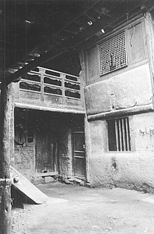 據(jù)傳,始建時木材取于附近一公里處原始森林的高原云杉。樓體為中國古代三合院式庭院布局,坐北朝南,南面正中為平頂大門。清代光緒年間拆除西面半座樓體,在東南面巧設(shè)銜接三間樓房相配。現(xiàn)今遺存為土木石材混合結(jié)構(gòu),占地200多平方米。整個庭院建筑由東南北三面10間、上下20間和大門組成。樓體通高5.3米,土平頂屋,封閉性較強(qiáng)。