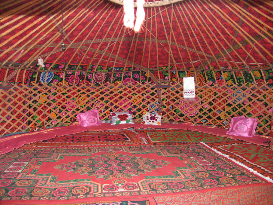 我國的塔吉克族一部分居住在氈房中,其氈房形狀與蒙古族的“蒙古包”相似,但有別于“蒙古包”,它是一種輕便、簡易、便于移動的住房。塔吉克族十分講究房內的擺設,通常會用各種掛毯、地毯來作為裝飾,具有濃郁的民族風格。