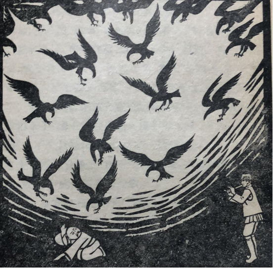 誰(shuí)知笛聲一響,成群的兀鷹像是聽了誰(shuí)的召喚,黑壓壓的一大片,直往奴隸主頭上飛來(lái)。奴隸主知道,只要鷹落下來(lái),自己就沒命了,便急忙向娃發(fā)求饒道:“快把鷹叫開,你要啥我給啥!”娃發(fā)隨口說(shuō)道:“給達(dá)卜達(dá)爾的塔吉克人每家十只羊,十頭牛,十峰駱駝,行嗎?”奴隸主連忙點(diǎn)頭:“行!行!要什么都給?!边@時(shí),娃發(fā)又吹起了“鷹笛”,鷹群才飛走了。