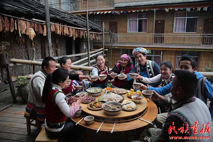 早上,老姆登村73歲的怒族老人斯普早早起來招呼兒子郁伍林、兒媳魯春花:“春節(jié)快放假了,客棧的生意會忙得不可開交,趁著現(xiàn)在客人不多,家里人先吃一頓團圓飯吧。”斯普老伴早年過世,7個兒女中老五郁伍林在身邊照顧她?!斑^去在春節(jié)才能吃上一頓好飯菜,也要準備很長時間,現(xiàn)在每天都有好吃的,天天在過年,多虧了黨的好政策?!闭f起今天的幸福生活,生在舊社會的斯普感慨萬千。