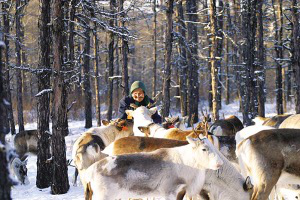 人類馴養(yǎng)馴鹿的歷史有1000多年。這是一種異常勇敢的生靈,生活在北極圈附近,分布在歐亞和北美大陸及一些大型島嶼。在極度惡劣的自然條件下,馴鹿為了繁育后代,每年都要冒著生命危險(xiǎn)長途跋涉數(shù)百里,其堅(jiān)韌不拔的意志力和不屈不撓的品格正是北極冰原精神的象征。在中國,馴鹿棲息在大興安嶺北段的寒溫帶針葉林中,處于半野生狀態(tài),這里有激流河、阿穆爾河、阿巴河、呼瑪河,有阿龍山、奧克里堆山等。食物主要是苔蘚,也吃石蕊、蘑菇及大木植物的嫩枝葉。鄂溫克族的祖先把鹿視為圣潔,賦予其許多美麗的神話和傳說。是啊,只要有了馴鹿,鄂溫克人便是幸福的。據(jù)考證, 我國的馴鹿與貝加爾湖東北部尼布楚河上游溫多苔原高地的馴鹿有淵源關(guān)系。可以說,鄂溫克人的馴鹿、狩獵、樺皮文化、薩滿教把北極文化延伸到了興安嶺。