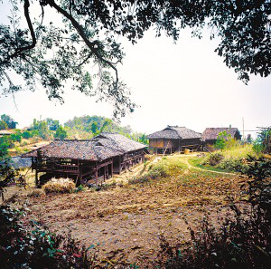 云南省潞西市三臺山鄉(xiāng)的德昂族居住分散,村寨很小,大都建在高半山上,山路行車困難。傳統(tǒng)住房為正方形干欄式竹木建筑,房屋兩層,為木柱結(jié)構(gòu)框架,竹篾編片圍墻,粗竹劈壓成自然的竹片做樓板,屋頂苫草排,當(dāng)?shù)厮追Q“草帽頂房?!?/p>
