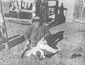 這之后,我們來(lái)到鄂倫春族的一個(gè)定居點(diǎn)——托河做調(diào)查。托河保留著比較完整的鄂倫春族狩獵文化,男人們打獵、捕魚,女人們則負(fù)責(zé)做飯、熟獸皮、用皮子做衣服等。女人縫獸皮衣時(shí),用的針還是骨針,線則是野獸的筋。當(dāng)然,她們還用樺樹皮做各種生活用品,如籃子、盒子、筒子等。