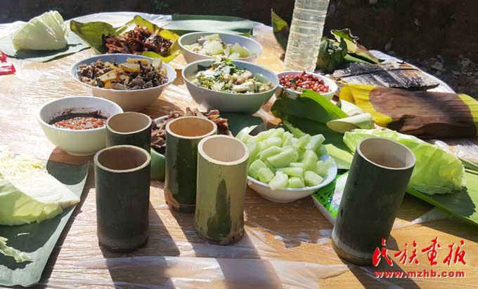 基諾族地區(qū)食材豐富,一日三餐,以大米為日常主食,雜以玉米、瓜豆等。每年5—9月的雨季,基諾山漫山遍野是食材,山藥、水芹菜、竹筍、魚腥草及各種菌類等無污染且很新鮮,是難得的烹飪材料,經(jīng)過簡單處理就成為餐桌上的美味佳肴?;Z族民間有句俗話,叫“漢炒、傣蘸、基諾舂”,也就是說漢族人喜歡吃炒菜,傣族的菜喜歡蘸著調(diào)料吃,基諾族的菜則以臼舂為主?;Z族的肉類的吃法較多,可以腌成干巴,也可吃新鮮的。酸腌魚、涼拌茶也是基諾族的最愛,基諾人做飯就餐均在竹樓二層的火塘周圍進(jìn)行,有一定的禮節(jié)和講究?;Z族吃飯時,主人首先要在火塘東側(cè)獻(xiàn)一點飯菜祭祀祖先和灶神,吃飯時全家人按順序在火塘旁圍蔑桌而坐,家長正對火塘,客人靠火塘而坐。