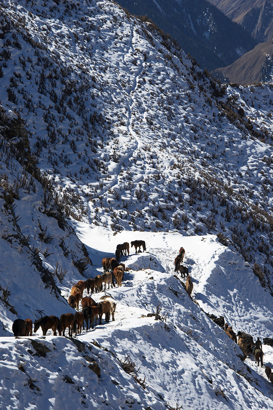 喬隆格爾冬牧場(chǎng)與山外的氣候差異大,暖陽如春。另一個(gè)突出特點(diǎn)是草好,草密的地方?jīng)]膝,縱橫倒伏一片,比南方秋田摞在一起的蒲草都密實(shí)??諝馇邃#菸秲?、上一年遺留的畜糞味兒和著遠(yuǎn)處高大冰崖透散過來的寒氣撲面而來,最突出的還有野生動(dòng)物的腥氣,牧羊犬夜夜不停地叫聲在告訴你它們往復(fù)經(jīng)過的頻率。山上能看到大角的北山羊,野鵪鶉被驚到嘩啦啦地飛起一片。若是誰家的羊死了扔在野外,幾天都能看到禿鷲在天空盤旋。最不可思議的是雪豹,光顧一次造成的損失遠(yuǎn)比一群狼大。