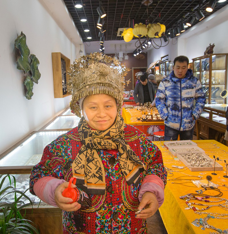 目前“苗奶奶”有12個(gè)員工,3個(gè)貴州人、9個(gè)西安人,店里的銀飾大都是她和女兒設(shè)計(jì)的。楊玉芬不僅在凱里老家開辦了銀飾加工廠,還在西安招收徒弟叫他們現(xiàn)場做。她的女兒從北京城市學(xué)院珠寶設(shè)計(jì)專業(yè)畢業(yè)后,現(xiàn)在西安一家大商場租了專柜經(jīng)營“苗奶奶”銀飾。幾年下來,“苗奶奶”在回民街名氣大增,日進(jìn)斗金,銀飾還多次賣到美國、澳大利亞和歐洲各國。這些年,隔三差五出國去展賣“苗奶奶”銀飾,對楊玉芬來說已成家常便飯,光是歐洲她就去了五六趟。