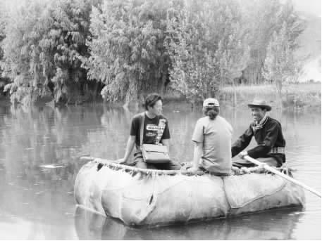 據(jù)當(dāng)?shù)厝私榻B,牛皮船構(gòu)造簡(jiǎn)單,用木頭做船架、牛皮做船體。首先采用比較堅(jiān)硬有彈性的樹木來(lái)做骨架,然后把牦牛皮泡在水里,將皮上的毛和肉全部去掉后,用四張牛皮并對(duì)縫起來(lái),趁牛皮軟時(shí)包在骨架上,同時(shí)用牛皮繩子捆緊繃好、曬干、擦油定型,再在牛皮接頭處采用牛、羊油來(lái)堵住縫口密封好,避免進(jìn)水。