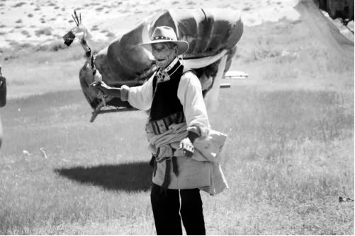 第三段叫“挑哈達(dá)”?!鞍帷背蹲88琛凡牟嘏劾锶〕龉_(dá),邊跳邊放在沙地上,牛皮船舞者們邊跳邊向前彎腰,用背著的牛皮船的左右上角從地上挑起哈達(dá)。第四段,唱《祝福歌》,歌詞大意是:“我們?cè)诖讼鄷?huì),但愿經(jīng)常相會(huì),經(jīng)常相見的人們,祝你們身體健康。”唱完后“阿熱”領(lǐng)頭向觀眾行禮下場(chǎng)。