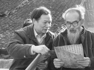 丹寨縣水書(shū)師潘廣禮(右)向潘朝霖解讀祖藏水書(shū) 吳欣供圖