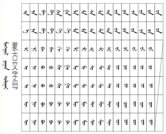 回鶻式蒙古文字是一種拼音文字。字母分元音和輔音兩大類,雖然至今人們尚未在文獻(xiàn)記載中發(fā)現(xiàn)其字母表,但據(jù)后人對這種文字材料進(jìn)行分析,歸納出有19個(gè)字母。其中,5個(gè)表示元音,14個(gè)表示輔音。書寫時(shí)元音字母和輔音字母筆畫連在一起,形成一個(gè)整體蒙古字。每個(gè)字母視其出現(xiàn)在詞里的位置不同,寫法略有變化,分詞首、詞中、詞末3種變體。阿拼寫時(shí)一般以詞為單位,上下連書。字序從上到下,行序從左到右。因其是以回鶻文為基礎(chǔ)創(chuàng)建的,因此稱其為回鶻式蒙古文。