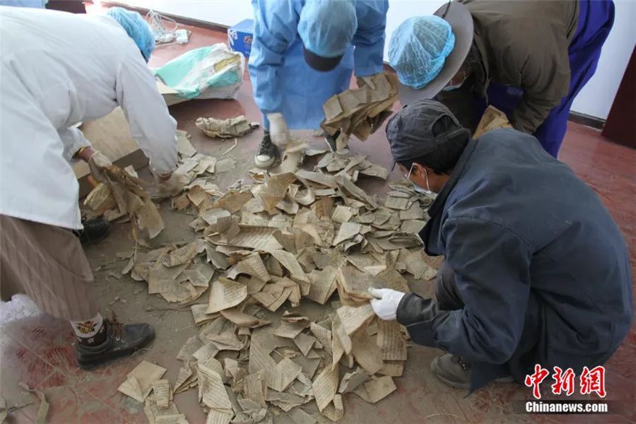 挖掘工作持續(xù)了3天才結(jié)束。由于當(dāng)時寺院條件簡陋,古籍散葉被臨時裝入編織袋中,足足裝滿了68袋。