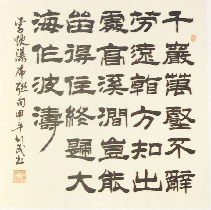 張行民的書(shū)法作品博覽眾家之長(zhǎng),悉心揣摩隸書(shū)之要義,領(lǐng)悟其精髓,加入其心志與感悟,漸漸形成了自己的風(fēng)格。他的作品灑脫飄逸,體骨厚重,參合有各派書(shū)體的筆意,同時(shí)又有自己個(gè)性和意境的張揚(yáng),字體端莊英武,體象收放凝度。賞其書(shū)法,總能給我們一種“渾然陣列,筋道玉骨”的美感,實(shí)屬不可多得。