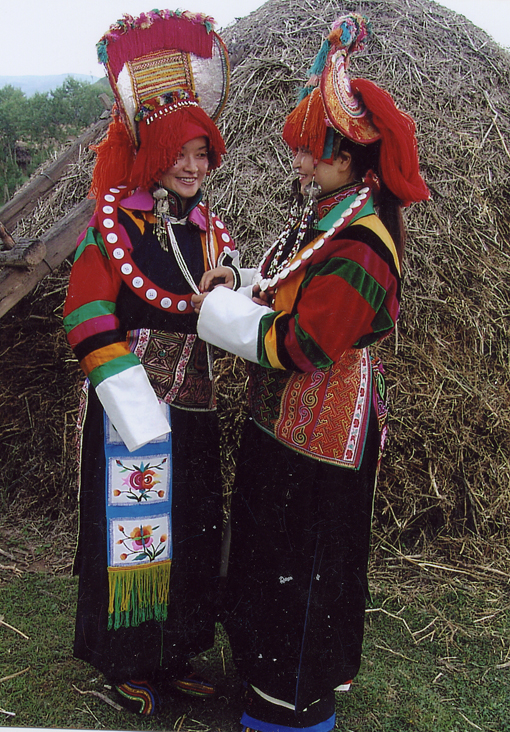 土族婦女服飾樣式繁多、色彩絢麗。頭飾大致有扭達(dá)、氈帽、禮帽、包頭等。扭達(dá)是土族婦女的主要頭飾,有學(xué)者認(rèn)為,可能是由古代的頭盔、戎裝演變而來(lái)。扭達(dá)種類很多,其中以互助、大通等地的“吐渾扭達(dá)”最為古老、尊貴。因“吐渾扭達(dá)”形似圓餅,也被稱作“干糧頭”。實(shí)際上,“吐渾扭達(dá)”為圓形布坯,以彩色布條鑲出圖案,邊緣飾以彩穗,背面上沿密密的插以鋼針,非常艷麗而華貴。土族婦女穿“秀蘇”,即花袖衫,俗稱“七彩袖”。長(zhǎng)衫為繡花小領(lǐng)斜襟,兩袖用紅、黃、藍(lán)、綠、紫、黑、白七色布縫制。長(zhǎng)衫上一般套穿黑色、藍(lán)色或紫紅色鑲花邊坎肩,腰系彩帶,腰帶左側(cè)通常系有小鈴鐺。土族婦女著褲裝或裙裝。褲子也多為大襠褲,褲子膝下部分套黑色或藍(lán)色的褲筒,土語(yǔ)叫“貼彎”。土族婦女的裙裝在土語(yǔ)中稱為“胡爾美”,一種是互助等地的紅色蝴蝶裙,另一種則是民和地區(qū)的百褶花裙,顏色艷麗、美觀大方。土族女士鞋通稱為“恰繞”,又可分為“腰鞋”“拉云子鞋”“其吉得鞋”等。各種“恰繞”等縫接腰襪,鞋尖飾彩色短穗,后跟縫合處接三指大小紅布溜跟。土族婦女還喜歡戴耳墜、耳環(huán)和項(xiàng)圈等首飾。婦女所戴項(xiàng)圈,土語(yǔ)中稱“索爾”,由硬質(zhì)的布片和金屬片制成。老年婦女的服飾不似青年婦女鮮艷多彩,主要穿小領(lǐng)、斜襟長(zhǎng)衫以及素色的坎肩、圓氈帽、“過(guò)家”鞋等。