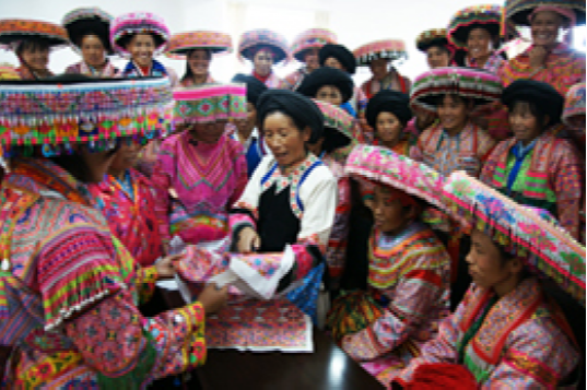 云南省南澗傳統(tǒng)的苗族服飾,均用多色麻線制作而成。在苗族服飾中,最讓人新奇的是女人的頭飾。苗族姑娘,習(xí)挽犄角形單發(fā)髻于頭頂,并將髻編于左或右。束發(fā)常用紗、綢帶,不同的苗族支系,采用的紗、綢顏色和花紋也有所不同,有的還佩戴系有“百家鎖”的銀項(xiàng)圈等。已婚婦女,一般都行編發(fā),并將發(fā)辮沿頭頂邊緣繞起來(lái),而且多以彎月形的梳子卡插于發(fā)盤頂心。在苗家人中,婦女的頭飾尤其特別,每逢喜事,他們都挽發(fā)髻如螺形,用較長(zhǎng)的青布或黑布,按縱向折疊為長(zhǎng)條,由一端起緊緊地盤繞于適合自己頭型的頂制帽基上。在疊繞成的大包頭之最外層表面上,配縫以彩帶垛疊的橫條,釘以32-48個(gè)貝雕,環(huán)圈密綴十字形亮子線,懸垂約5厘米的小銀鏈數(shù)10條,以及小銀鈴若干串。除精制的頭飾外,苗族女人的上衣下著都頗具特色。上衣有平裝和禮裝,下著有各式褶裙,腰上系的有桃花圍腰或有須腰帶。有的還有精美別致的短衣,也有特顯精巧的無(wú)袖布褂,以及彩繡鑲邊的布涼鞋等。在繁多的苗族服飾中,最顯著的特色是,不論衣裝大小,也不論上衣下著,在衣領(lǐng)、袖口、裙邊、裙底上,都鑲有臘染圖案和“米”字形花紋的條幅。苗家人穿上自己繡制的服飾,情趣非同一般,尤其是那些將要出嫁的大姑娘或已經(jīng)過門的新娘子,更會(huì)把自己打扮得花枝招展,漂亮迷人,對(duì)自己美如畫卷的服飾她們也是珍愛如寶。苗族男人的服飾,比女人簡(jiǎn)單,上衣為對(duì)襟短衣,下著褲子,一般也以短褲較多,頭飾多為半球形布帽或頂發(fā)外露的青色小包頭,但都有精制彩繡垛邊。大量使用飾物和刺繡,是苗族服飾的最大特色。