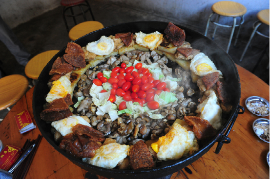 平壩凹鍋更具特色,食材十分豐富,為了拍攝平壩凹鍋小吃,我們一行來(lái)到當(dāng)?shù)厝俗诎l(fā)英家開的勤發(fā)飯店,并被安排在二樓的里間。屋內(nèi)正中支著一口平底銅鍋,下面是燒著炭火的爐子?;鸷芡?,不一會(huì)平底鍋里的油便嗞嗞作響,主人把煎得黃黃的臭豆腐、豌豆粉等放到鍋里,鍋的中間加上一些蔬菜、小個(gè)西紅柿,色彩非常漂亮,周圍都放著一碗碗用噴香的辣椒面拌有濕蘸水和干蘸水。