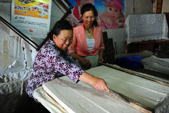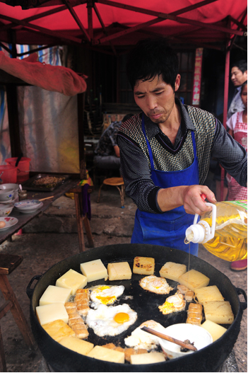當(dāng)天上午,在拍攝好平壩古鎮(zhèn)之后,我們一行首先來(lái)到位于老街的馬曉忠家,他家的房子雖然街面不寬,但是進(jìn)深有30多米,全都堆放著加工用的工具,記者發(fā)現(xiàn),慕名而來(lái)品嘗小吃的人不少,還有些則是打包帶走,主人正在忙著煎豌豆粉和臭豆腐,他家平均每天要各加工60斤左右的豌豆和50斤左右黃豆,到了冬臘月間,就要做得更多了。沒(méi)有請(qǐng)小工,全靠夫妻兩二及小女下班后來(lái)幫幫忙,打打下手。馬曉忠說(shuō),制作過(guò)程非常辛苦,天不亮就開始,再加上做臭豆腐,基本一天中很少有閑著的。