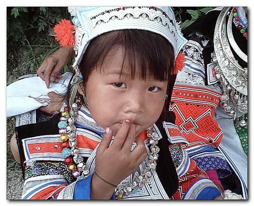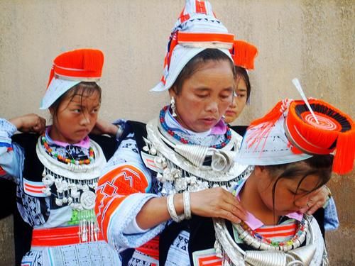 圖為革家姑娘在接請姑媽過“十四”前,母親總要為女兒作一番打扮
