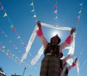 藏族自古崇尚白色,認(rèn)為白色是純潔、吉祥、誠摯、善良、正義和繁榮的象征。藏族崇尚白色由來已久,先民們把羊毛掛在門楣和各種器皿上;山口、要道的嘛呢石堆上放白色石頭;插箭祭“拉則”(山神的居所)時,在箭桿上系白色羊毛等等,無處不見白色崇拜的印記,藏族居住的青藏高原人們習(xí)慣稱做雪域,作為最常見的景物伴隨著民族漫長的歷史,白色更自然地進入藏民族的審美觀念中,滲入藏民族的靈魂深處。