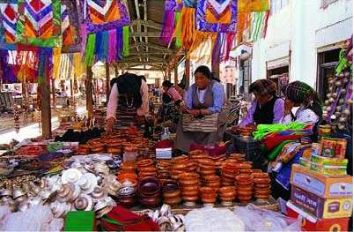西藏的地勢西北高而東南低,西北寒冷而東南溫和,西北以牧業(yè)為主,東南以農(nóng)業(yè)為本,西北以皮袍御寒,東南多以氆氌裝遮體。皮袍和氆氌裝質(zhì)地不同,但都結(jié)構(gòu)肥大,袖口寬敞,穿著自如,白天陽光充足,氣溫高時(shí),可脫袖露臂,調(diào)節(jié)體溫,夜間可解帶和衣而眠。皮袍和氆氌裝一般均用腰帶,男子穿時(shí)提起下擺與膝平齊,腰帶一束,懷里形成空囊,里面可裝不少隨身用品。只要出門,懷中一般必有一件不可缺少的東西,就是木碗。一般的木碗價(jià)廉物美,平民百姓承受的起,更重要的原因還有與不共碗習(xí)俗有關(guān)。