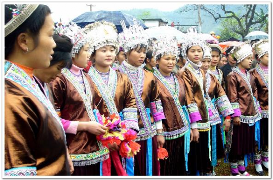 廣西融水縣的香粉古龍坡會于每年農(nóng)歷正月十六舉行,所以又名“十六”坡。這一天、來自外國朋友、各地的游客及當(dāng)?shù)胤綀A十里的苗哥苗妹,提蘆笙,提鳥籠、牽馬匹,打花傘……朝著十六坡趕來。正午時(shí)分,山梁上、村道間、河溪旁,出現(xiàn)了成列成隊(duì)穿紅戴綠的人群。遠(yuǎn)遠(yuǎn)望去,似一條彩帶在飄動。當(dāng)萬余人江集后,整個(gè)坡地就成了彩色的世界。