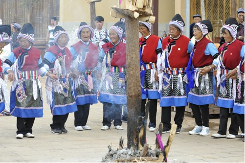 不到黃昏,鞭炮聲就響起來了。新生兒的父親點燃火把后,孩子們迫不及待地拿著小火把和松明粉,跑來跑去燒新生兒的的各種親戚,大人們樂呵呵地接受孩子們噴灑過來的火焰,并一致說著很吉祥的祈愿祝福語。“從此晦氣不在嘍!”、“一年更比一年好呀!”、“紅紅火火又一年”。男女老少在火把樹下吃喝玩樂,其樂融融。糖、炒蠶豆、梨、蘋果等被大家傳來傳去,新生父親挨個向親友敬酒。親友鄰居喝著喜酒,一致祝福新生兒安康成長,將來富貴吉祥。