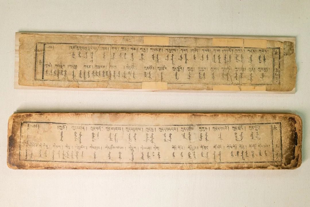 藏蒙對(duì)照詞典《詳解月光辭典》又稱(chēng)《浩月輝映詞典》,該詞典由阿拉善拉隆巴阿旺丹德?tīng)柧幹宓拦馐四辏?838)北京嵩祝寺木刻本。1卷,139葉,頁(yè)面尺寸10.6×56厘米,版框尺寸7.5×49厘米,四周雙欄,梵來(lái)裝。每頁(yè)以藏蒙、藏蒙四行為階梯排列,每列35行,每行1字。頁(yè)面左側(cè)有藏文頁(yè)碼,右側(cè)有漢字《永》和漢文頁(yè)碼。