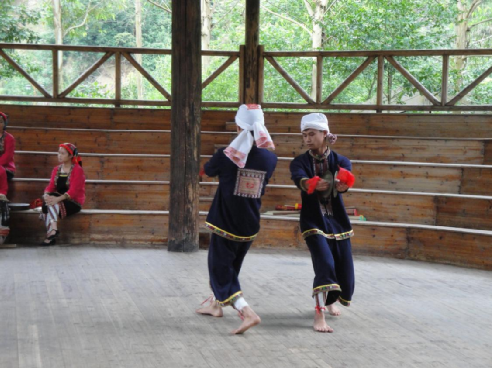 銅鼓舞,在廣西都安、巴馬、東蘭、馬山一帶的瑤族地區(qū)盛行。每年農(nóng)歷五月二十九過“祝著節(jié)”(年節(jié)),要敲12天銅鼓,表示懷念祖宗和預(yù)祝豐收。節(jié)日隆重,聚眾數(shù)以千記。跳舞時,用銅鼓一對,其意一雌一雄,公聲小,母聲大。由兩男敲擊,兩男持雨帽回環(huán)擊鼓者扇搖,還有兩男兩女,應(yīng)鼓樂節(jié)奏翩翩起舞,舞姿雄健優(yōu)美,氣氛熱烈,十分感人。