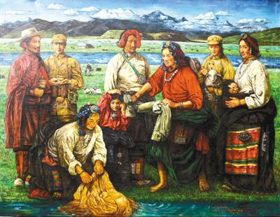 “以前畫(huà)畫(huà)時(shí),對(duì)自己的最高要求就是畫(huà)得要逼真,把油畫(huà)畫(huà)得像一幅放大了的照片,而現(xiàn)在關(guān)注的是如何畫(huà)出能體現(xiàn)當(dāng)代的畫(huà)面。西藏的美是無(wú)窮無(wú)盡的,我就想用繪畫(huà)的方式窮盡一生去追求,展現(xiàn)大美西藏?!比缃竦乃髀?,淡去了初出茅廬時(shí)一味追求畫(huà)面質(zhì)感的匠氣,多了些許內(nèi)心對(duì)西藏這片熱土深層次的思考。他筆下的西藏是一片充滿(mǎn)生機(jī)的土地,濃墨重彩之間,既有對(duì)傳統(tǒng)和過(guò)往年華的回望和懷念,又在仿若不經(jīng)意間透過(guò)一個(gè)眼神、一抹色彩、一個(gè)小物件盡情詮釋活力和希望。