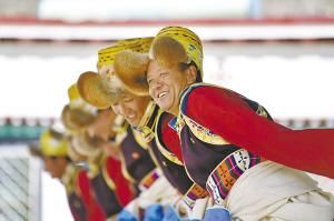 在西藏昌都市芒康縣,眾多演員同臺獻藝,表演國家級非物質文化遺產——弦子舞。 孫非攝