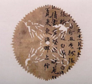 考古人員在阿斯塔那墓葬中還發(fā)現(xiàn)了兩種不同的人形剪紙,一種是剪成并排而立的7人形狀,近似泥俑;另一種在一張寫(xiě)有文字的圓形紙上,剪刻了4個(gè)站立著的人形紋。這兩種人形剪紙?jiān)煨秃?jiǎn)潔,圖案清晰,充滿濃郁的生活氣息。