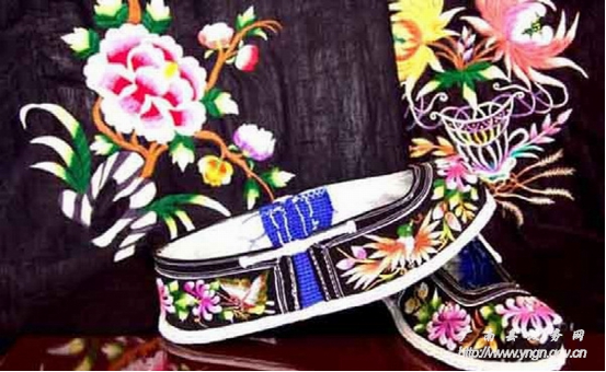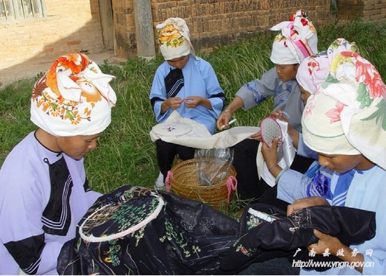 廣南刺繡歷史悠久,遍及壯鄉(xiāng)苗嶺,瑤山彝寨,街頭巷尾,處處都是刺繡的天地。壯族青年婦女的頭飾、圍腰心、圍腰頭、高綁布鞋要繡上圖案裝飾,兒童戴的貓頭帽、花風(fēng)帽、燕尾帽、月牙帽繡有花邊絲綢,帽前鑲有十八羅漢銀器像,帽的左右兩邊掛有兩串銀器以示吉祥,壯族婦女的外衣繡有三角形、四方形花紋圖案,廣南壯族人民使用的生活用品,如被套、枕巾、桌布、窗簾、手帕以及婦女背小孩的背帶、兒童披風(fēng)和靈芝鞋等都要繡上花鳥(niǎo)小草點(diǎn)綴,體現(xiàn)出美的情致。