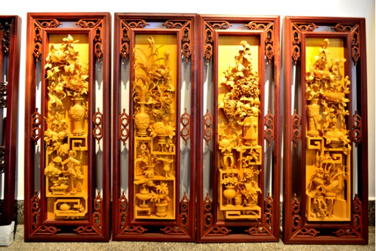 《四條屏掛件》脫胎于“格子門”的上裙板,是由實(shí)用到觀賞的一種很好的轉(zhuǎn)換,是目前最走俏的新產(chǎn)品,無論是賓館客廳或居家,古樸典雅的木雕“四條屏”會增添不少東方文化的雅趣,越來越受到人們的喜愛,許多人都把它作為木雕藝術(shù)珍品收藏。為了給世人留下藝術(shù)精品,許多工藝師潛心研究設(shè)計(jì)、精心雕刻,用半年、甚至一年多的時(shí)間才完成一件“四條屏”。這些精心之作,疏密有致、變化統(tǒng)一,構(gòu)圖飽滿,穿插纏繞,重重疊疊的層層透雕,無不凝聚著制作者的智慧與心血?!端臈l屏》的圖案設(shè)計(jì),主要有三種內(nèi)容:(1)博古;(2)花卉;(3)花鳥。人物、山水類型的極少。圖案喻意與格子門相近。