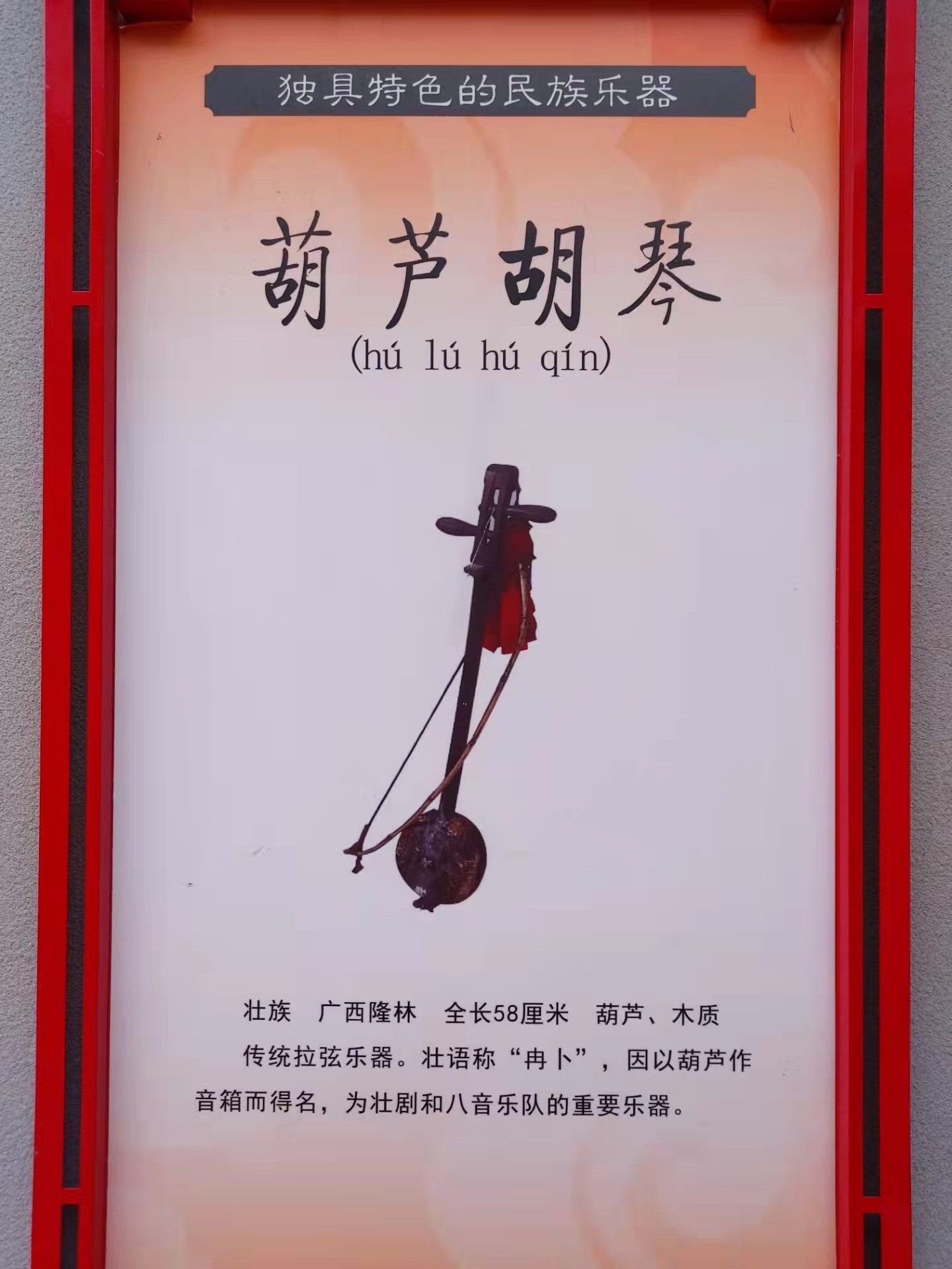 傳統(tǒng)拉弦樂器。壯語稱“冉卜”,因以葫蘆作音箱而得名,為壯劇和八音樂隊的重要樂器。