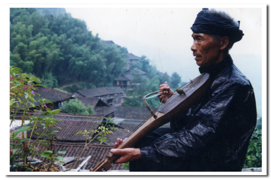 果哈是苗族唯一的古老的民間弓弦樂(lè)器,因其形似瓢,故苗語(yǔ)稱之為果哈(意即瓢琴),是唱古歌時(shí)不可缺少的伴奏樂(lè)器,一般以歌師自拉自唱為主。制作工藝比較粗糙,先選一段長(zhǎng)60厘米、直徑為15厘米左右的鴨腳木或泡桐木制成琴身,在其二分之一的一端剜成瓢狀,封住薄板作共鳴箱。另一端修成琴柄,在琴柄頂端鉆孔安琴鈕,用棕繩、牛筋作琴弦,用竹片和綜絲制成弓。琴置兩弦,演奏時(shí)以人的唾液代替松香,演奏者時(shí)而將弓毛放入口中,讓弓毛增加溫度,增強(qiáng)與琴弦的磨擦,使之發(fā)音。果哈音量微弱,發(fā)音低沉,但音色獨(dú)特,與苗歌語(yǔ)調(diào)相當(dāng)協(xié)調(diào),較適合表現(xiàn)安靜、深沉情緒,故常為苗族敘事古歌伴奏。