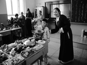 結(jié)合學(xué)生多方面、多層次的實(shí)際需要,以民族特色課為切入點(diǎn),不斷加強(qiáng)和改進(jìn)蒙古族文化傳承教育,每校開設(shè)2—3項(xiàng)傳統(tǒng)體育、文藝項(xiàng)目課,通過(guò)直接、專門的形式對(duì)學(xué)生系統(tǒng)地開展蒙古族文化傳承教育。民族小學(xué)的蒙古象棋、馬頭琴和小小烏蘭牧騎基地已全面規(guī)范。2008年起設(shè)立民族幼兒園沙嘎游戲基地和傳統(tǒng)禮儀課,民族小學(xué)搏克基地、版刻活動(dòng)室、皮藝活動(dòng)室、鄂溫克語(yǔ)言課,民族中學(xué)搏克班、射箭班、蒙古象棋班,將蒙古族文化融入滲透到教學(xué)全過(guò)程。