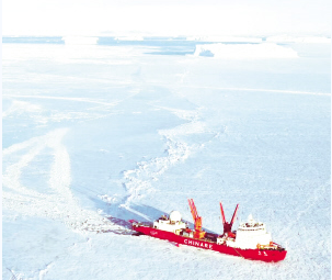 “雪龍”號是中國最大的極地考察船,也是中國唯一能在極地破冰前行的船只?!把垺贝秃?,能以1.5節(jié)航速連續(xù)沖破1.2米厚的冰層(含0.2米雪)。簡單來說,“雪龍”號船底有許多密封艙,破冰時先把后部的密封艙用幾千噸的海水灌滿;這樣船頭自然翹起,壓騎至冰面之上;然后再把前部的密封艙灌滿海水,后部的海水排出,利用船體前部的巨大壓強,把堅冰壓裂破開。