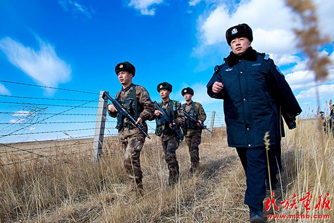 諾門罕布日德邊防派出所副所長(zhǎng)敖日奇朗(右一)帶領(lǐng)民警與解放軍邊防連隊(duì)聯(lián)合巡邏。