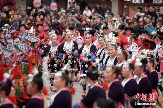 2021年11月19日,廣西龍勝各族自治縣各族民眾身著節(jié)日盛裝共跳團結(jié)舞慶祝自治縣成立70周年。中新社記者 俞靖 攝