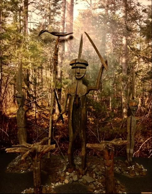展區(qū)內(nèi)還放置著一組木質(zhì)神偶,這些神偶來(lái)自赫哲族部落。佇立在最中間的神偶起著山神的作用,面目清晰與人等高,手中舉著木劍,挖空的腹部能吞掉妖魔鬼怪,一顆碩大的心臟代表強(qiáng)悍的法力,靠墻斜放著一根高高的木桿,頂端棲息著一只鳥(喬卡鳥)。