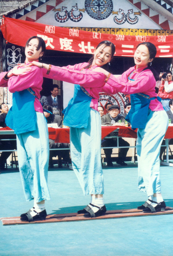 壯族傳統(tǒng)的娛樂性舞蹈主要是在節(jié)日或喜慶期間舉行。類型主要為模擬勞動舞和擬獸類舞兩種。模擬勞動舞表現(xiàn)壯族人民的生產(chǎn)勞動的樂趣。如紅水河流域的壯族在春節(jié)舉行的孝蛙婆活動中所跳的撈蝦舞、捕魚舞、狩獵舞、撒秧舞、插田舞、收割舞。壯族各地流行的扁擔舞、采茶舞、繡球舞、舂堂舞、板鞋舞等。這類舞蹈的動作舒緩柔和、抒情柔美、表現(xiàn)了農(nóng)業(yè)民族的細膩性格。擬獸類舞是模仿獸類肢體語言的一種舞蹈,此類舞蹈在壯族地區(qū)也頗為流行。最常見的是蛙舞、舞獅、舞龍、和舞春牛?;ㄉ缴系耐苄挝枳穗p手彎肘向上,兩腿半蹲成騎馬式,動勢很大。此外,壯族各地還有螞拐舞、彩蝶舞、魚蚌舞、馬鹿舞、金雞舞等。動作總體來說舒緩柔和、抒情柔美。但表現(xiàn)勞動的舞蹈緊張熱烈,表現(xiàn)抗爭的舞蹈粗狂有力,模擬動物的詼諧逗趣,呈現(xiàn)出多姿多彩的形態(tài)。