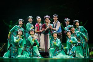在舞劇敘事方式上,總導(dǎo)演之一董華興將民族性與現(xiàn)代性相融合,嘗試時空切換,段落重組,故事情節(jié)的倒敘、插敘,真實性與虛擬性相結(jié)合等方法?!耙魳分谱?、舞蹈語匯、服裝設(shè)計等方面都要符合當?shù)厝罕姷纳?,接地氣老百姓才會喜歡?!薄缎腋;ㄉ健房倢?dǎo)演之一馬文靜說。