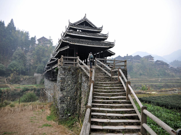 風(fēng)雨橋以石拱木作,廊、屋、亭、閣為一體,造型別致、美不勝收。無論是遠(yuǎn)眺還是進(jìn)觀,都體現(xiàn)出獨(dú)特的審美意境。鏈接廊橋與屋亭的是長(zhǎng)條青石,橋與村寨的連接則用花石鋪路,橋面主體是當(dāng)?shù)厮寄静摹_@種自然生態(tài)環(huán)保的理念,更彰顯了瑤族人民獨(dú)特的審美境界。