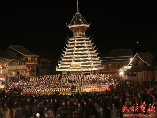 后來,鼓樓功能逐漸擴大,不僅有擊鼓報信,召集族人議事的場所功能,還成為村寨的娛樂休閑中心。鼓樓在侗語叫“百”,意為“扎堆”、“聚集”。農閑時節(jié)或耕作之余,人們來到鼓樓下聊天、唱歌、講故事。每逢喜慶節(jié)日,盛裝的侗家人就會在鼓樓坪歡聚一堂,吹蘆笙、踩歌堂,演侗戲,年輕人甚至利用這個場所對歌敘情、談情說愛。正如侗族民歌中所唱“鼓樓是村寨的暖和窩,沒有鼓樓無處尋歡樂,高高的杉木豎起鼓樓來,有了聚集的地方有了歡樂的歌”,這些正是對鼓樓功能擴大的最好佐證。