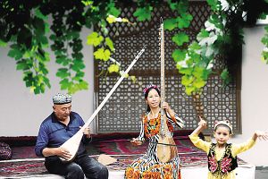 走進(jìn)艾依提·依明家,更像是走進(jìn)了一座民族樂器展覽館。記者看到,庭院中央鋪著紅色的地毯,4名自治區(qū)級非遺傳承人一字兒排開,正演奏著維吾爾族傳統(tǒng)音樂十二木卡姆的篇章,前來參觀的游客們也紛紛參與到歌舞表演之中。彈奏結(jié)束后,傳承人之一的買買提·鐵木爾熱情地向觀眾展示手中精致的都塔爾,自豪地分享著自己摸索出來的一套制琴和調(diào)音的秘訣。