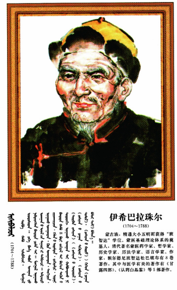 伊希巴拉珠爾(1704~1788),蒙古族,一名也協(xié)班覺、額爾德尼班智達(dá)·松巴堪布,蒙古衛(wèi)拉特人,著名蒙醫(yī)學(xué)家、文學(xué)家、天文學(xué)家哲學(xué)家。一生著作豐厚,其中對完善蒙醫(yī)理論體系有重要影響的著作有《甘露之泉》、《白露醫(yī)法從新》、《甘露點滴》、《甘露匯集》和《認(rèn)藥水晶鑒》,在這些著作中他將藏醫(yī)學(xué)理論與蒙古人的體質(zhì)、生活習(xí)俗、居住地區(qū)的地理、氣候條件等具體實際結(jié)合在一起,進行創(chuàng)造性的理論研究,不僅豐富了臨床實踐的內(nèi)容,而且補充和完善了蒙醫(yī)學(xué)的理論體系,他將傳統(tǒng)蒙醫(yī)學(xué)“寒熱理論”與《四部醫(yī)典》中關(guān)于寒熱病理論的闡述進行有機結(jié)合,使之成為近代蒙醫(yī)學(xué)病性辯證的總綱,同時,他也闡述了將六基癥作為病因鑒別診斷的核心及其臨床表現(xiàn),使“六基癥”學(xué)說從理論到實踐都獲得了比較系統(tǒng)的發(fā)展。占布拉道爾吉是19世紀(jì)著名的蒙藥學(xué)家,他編著的《蒙藥正典》(又名嗚嗚蒙藥圖鑒)共收載蒙醫(yī)臨床常用藥物879種,按礦物、植物和動物等分為8部24類,附插圖576幅,對每種藥物的產(chǎn)地、形態(tài)、性味、功能、入藥部分、采集加工、炮制方法、主治、用法等都闡述詳盡,并且每一味藥物都標(biāo)寫了蒙、藏、滿、漢四種文字的藥名,具有很高的參考價值。該書還附有外科術(shù)療器具圖解,以及放血穴位、針灸穴位、人體各部分劃分圖解說明等。敏如爾古布拉(1789-1838)編撰了蒙醫(yī)學(xué)方劑巨著《方?!?,是一部比較系統(tǒng)完整的蒙醫(yī)藥物方劑學(xué)經(jīng)典著作,收載方劑近200種,分為76章,進行詳盡的論述和評點,同時對相關(guān)疾病的病因、病機、分類和治法等也做了簡要論述。