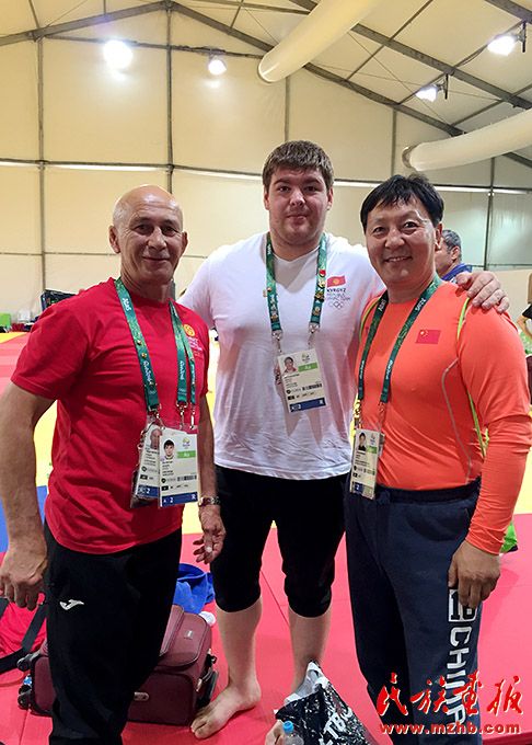 2016年,里約奧運(yùn)會(huì)期間,烏日根桑格(左)與中國國家柔道隊(duì)隊(duì)員于頌(中)、國家柔道隊(duì)原主教練程志山合影留念。