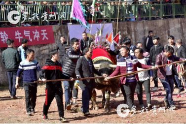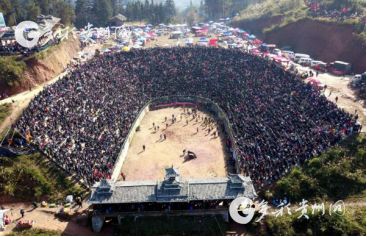貴州省從江縣第十五屆原生態(tài)侗族大歌節(jié)的前一天,恰逢該縣逢亥斗牛日,丙妹鎮(zhèn)松學斗牛塘、谷坪鄉(xiāng)四寨河斗牛塘同時舉辦傳統(tǒng)牛王爭霸賽,喜迎一年一度“侗族大歌節(jié)”的到來,共有來自周邊村寨的80頭水牯牛參戰(zhàn),斗?;顒訄錾厦=侵穑瑘雒娈惒始姵?,吸引數(shù)萬名觀眾前來觀戰(zhàn)。